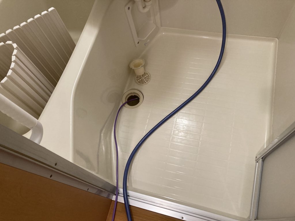 洗浄作業のために、シンクや浴室、洗濯パンの排水口を開け、専用ホースを挿入します。