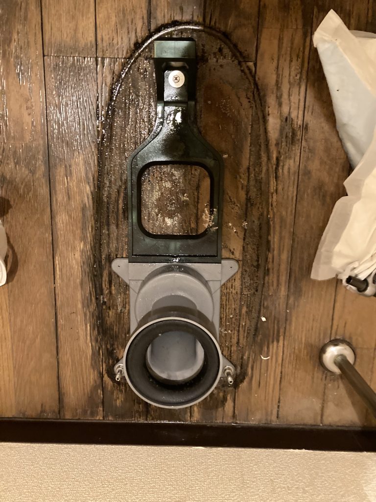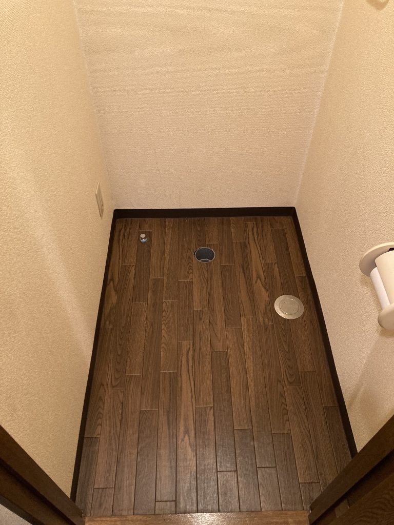 などのケースが多いですが、今回は便器本体と排水管をつないでいるアジャスターと呼ばれる部品の接続部から漏れていました。現場調査時にフローリングの床が若干水を含んで湿っていましたが、賃貸入居者様のご協力で工事まで最低限の使用でしのいで頂いたこともあり、床フローリングまではやり替える必要はありませんでした。オーナー様と相談し今回は木目調のクッションフロアを上張りでの施工になりました。クッションフロア施工後トイレを設置し完了となりました。