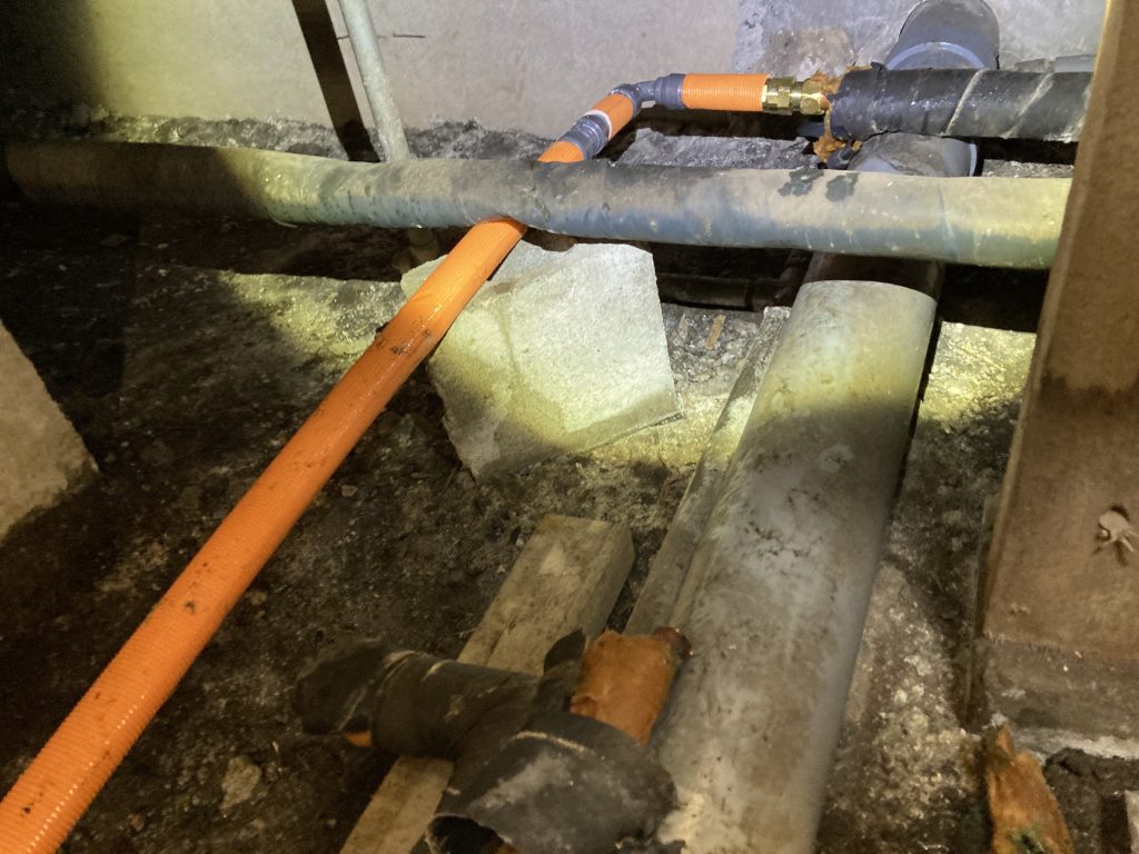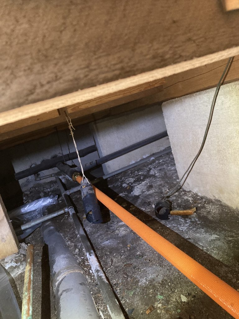今回の施工では、床下にある給湯銅管の一部にピンホールが発生しており、その区間をポリ管へ交換しました。