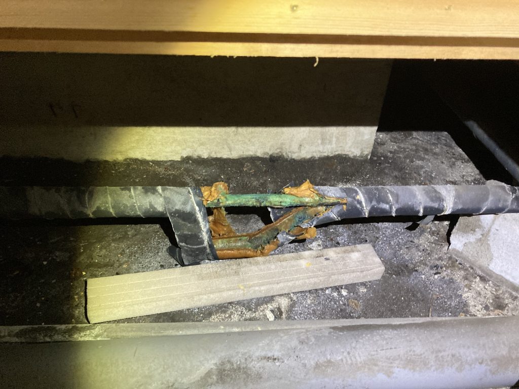 こちらのお宅は床下に潜れる点検口が設置されていたため床下を確認したところ、台所蛇口系統につながる銅管で漏水を発見しました。