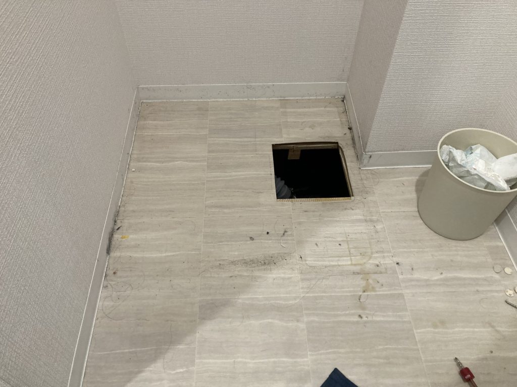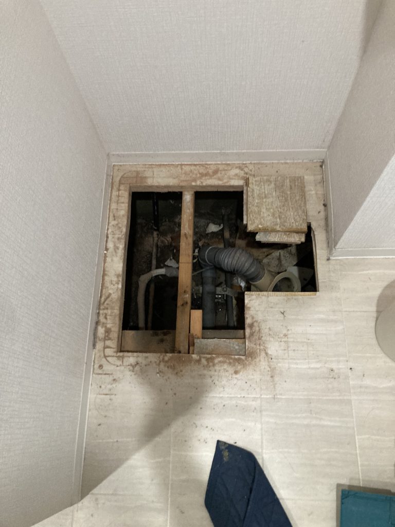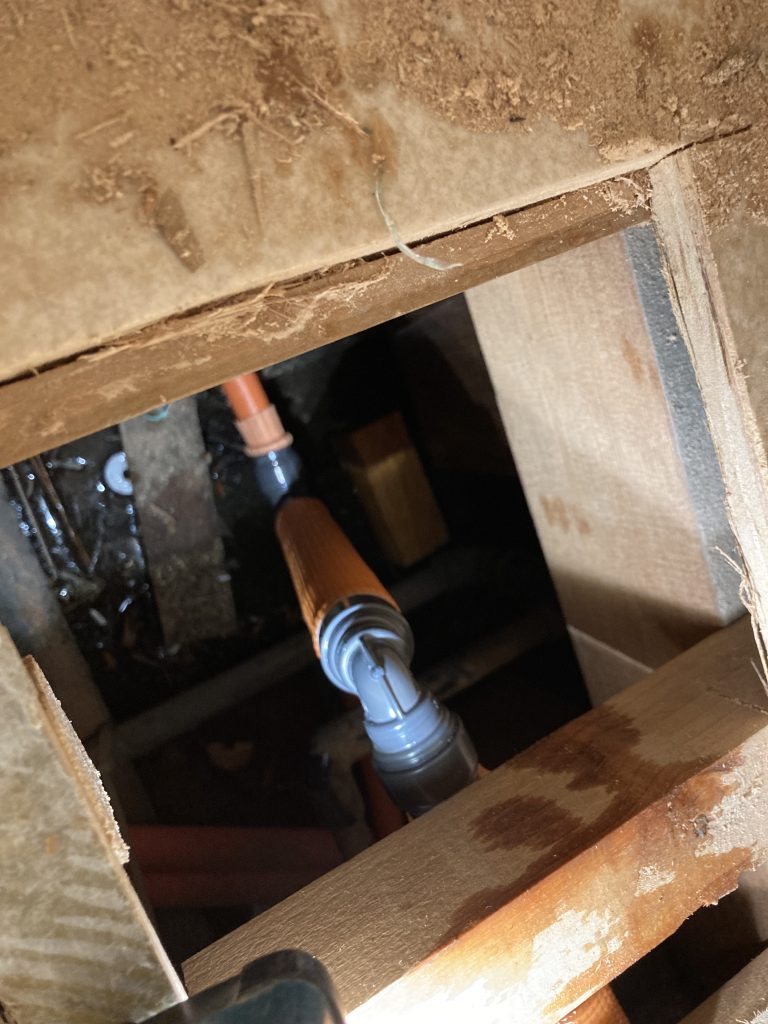 こちらのお部屋では水回りを含めて間取り変更のリフォームを実施されていたようで室内は新築同様でしたが、古い既存の配管をそのまま使用されて一部のみ架橋ポリエチレン管に変更されていました。当然新しくした配管では漏れておらず、使いまわした既存の給湯管(銅管)で大量に漏れていました。該当するお部屋が1階だったこともあり床下で漏れ続けてしまったため発見も遅れてしまいました。